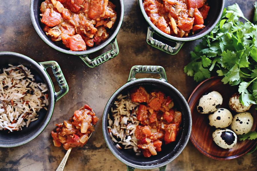 Put a small layer of rice on the bottom of each ramekin, remove cinnamon stick and add Vindaloo gravy to 4 individual small ramekins. Crack one quail egg on top of each skillet and bake for 4-5 minutes, until yolks are slightly firm and whites begin to appear.
